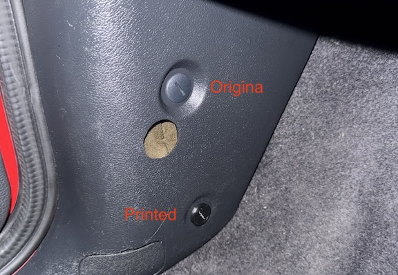 Here’s a trim panel fastener in 3d print file. I think this one is only fitted on Mk3.5, early ones are a different panel. Item 18 on this diagram Original on left. Printed on right; Other way round; Here it is installed; Download here, .3mf in a zipped folder;