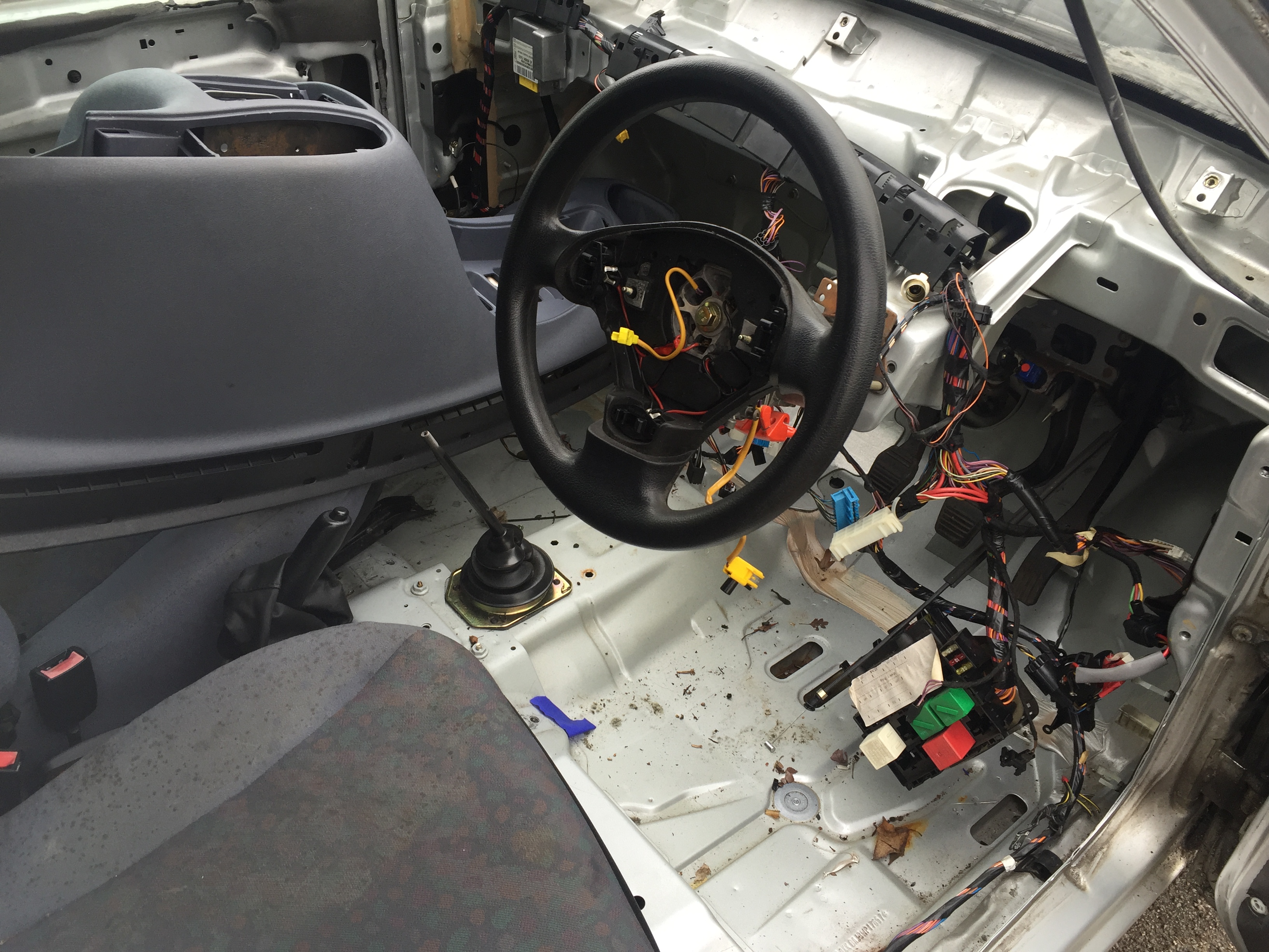 Underlay, carpet, bulkhead sound deadening taken (handy as the floorpan is the same!) Part of the floor pan incorporates a section that goes from side too side of the car, the front seats, front securing bolts go into it – I’ve taken this out (which was an absolute mission) as it is the same as a mk3.5, which means I will be able to fit mk3.5 seat subframes (much better in my opinion!), my mk3.5 carpet will fit better and as the 3.5 subframes incorporate the seat belt buckle, i won’t have to have a buckle stalk coming out of the floor/carpet.