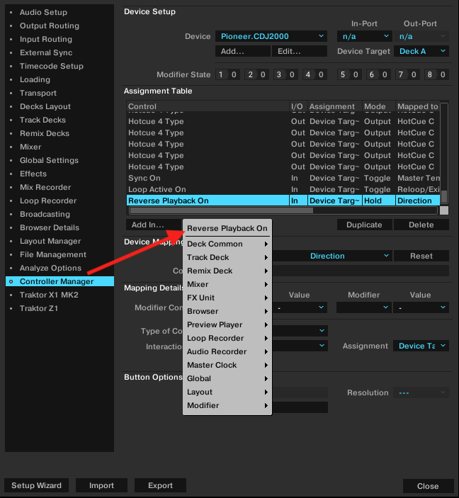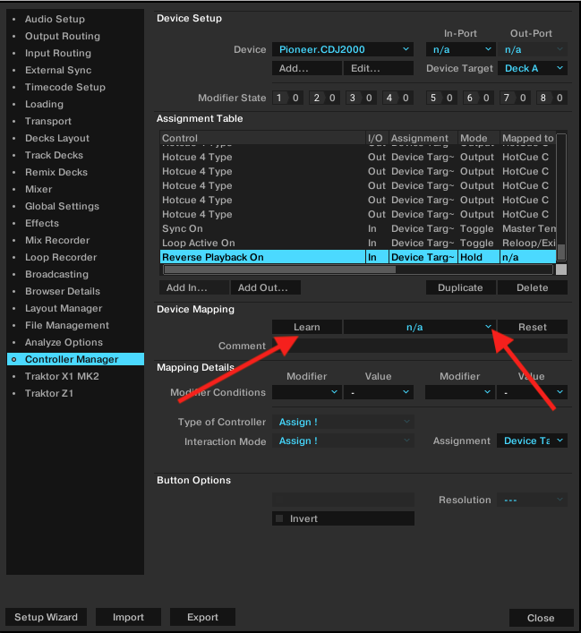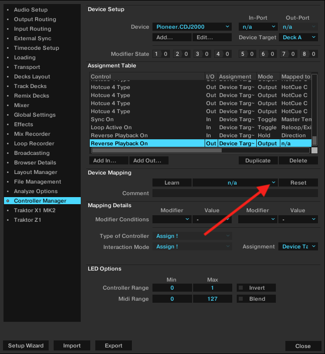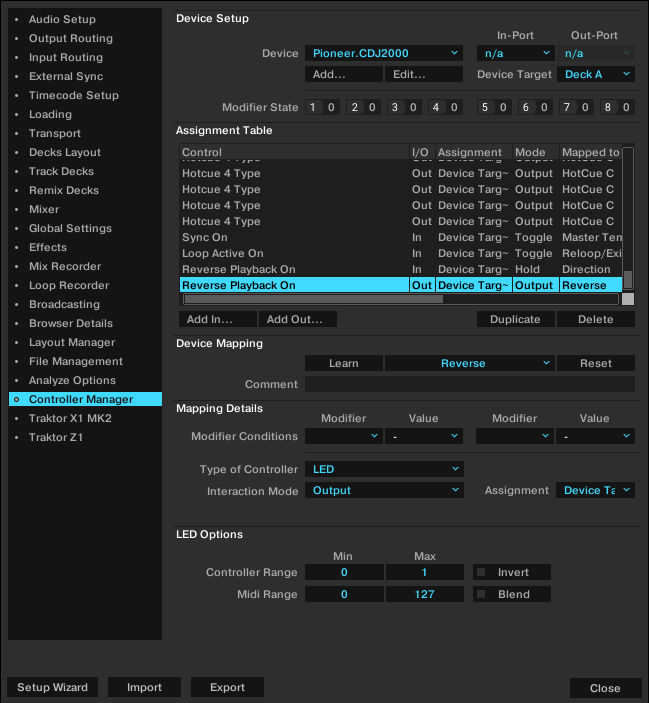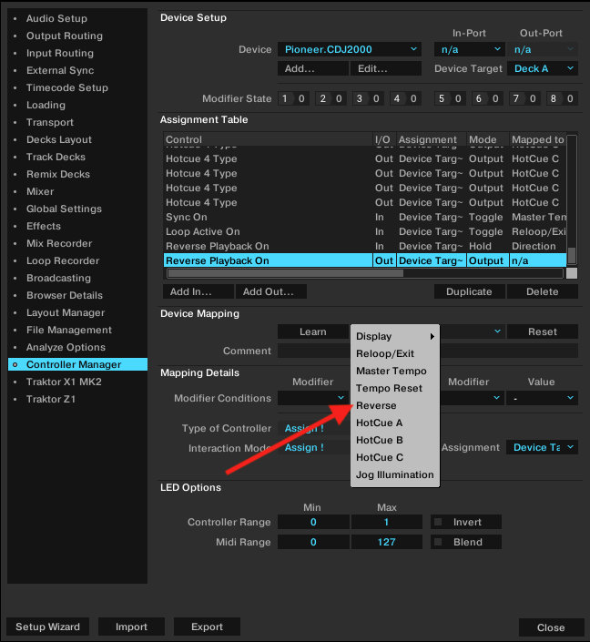 What we will be doing is mapping an ‘In’ and ‘Out’ function. The ‘In’ recognises that you have switched the reverse toggle over on the CDJ and the ‘Out’ tells the LED next to the reverse toggle to turn on.
